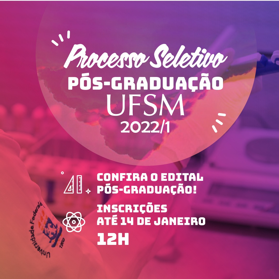 As Coordenações dos Programas de Pós-Graduação e a Pró-Reitoria de Pós-Graduação e Pesquisa (PRPGP) da UFSM divulgam o edital do processo seletivo de pós-graduação, em nível de doutorado, mestrado e especialização, para ingresso no primeiro semestre letivo de 2022. As inscrições podem ser feitas até 14 de janeiro, às 12h. A solicitação de isenção de