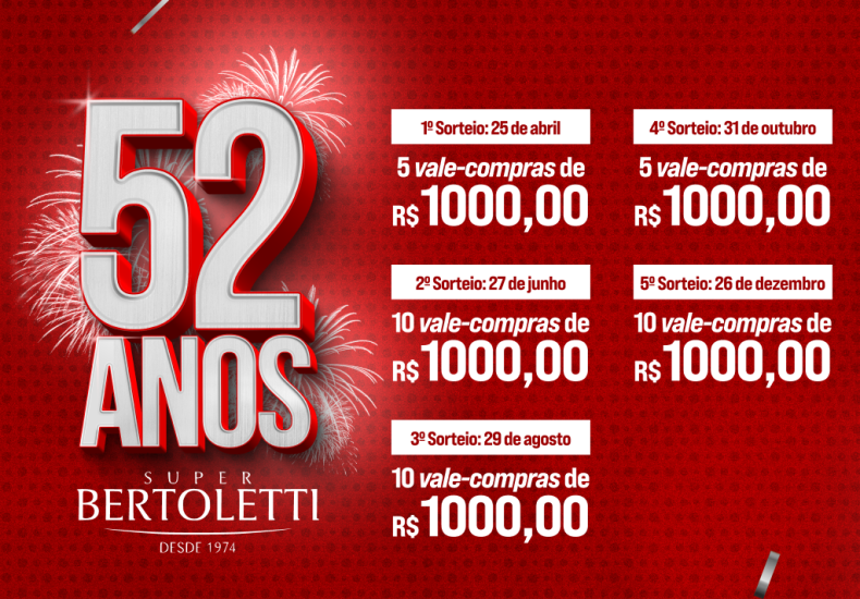 O Supermercado Bertoletti dará início no sábado, 25 de abril, aos sorteios da campanha especial de aniversário que celebra os 52 anos de história da empresa. Reconhecido por sua proximidade com a comunidade e compromisso com a qualidade, o Bertoletti preparou uma campanha que irá distribuir, ao longo de 2026, um total de R$40 mil