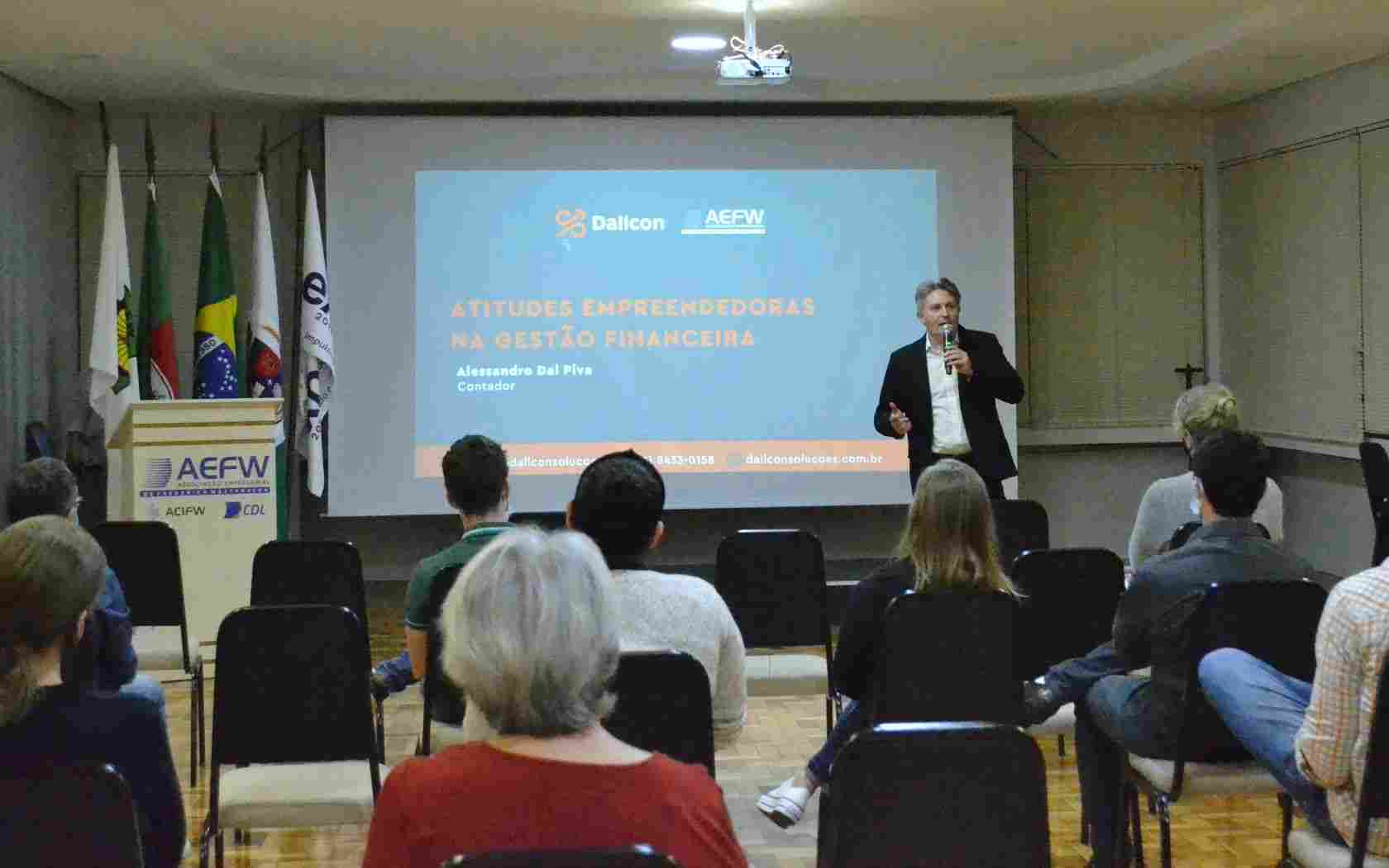 O Núcleo Jovem da AEFW promoveu uma palestra gratuita sobre Atitudes Empreendedoras na Gestão Financeira, na noite desta terça-feira, 5, no salão nobre da entidade. O palestrante convidado foi o contador e especialista em controladoria Alessandro Dal Piva, que também atua no grupo de consultores da SEBRAE e no Seminário EMPRETEC – ONU/SEBRAE. Alessandro falou