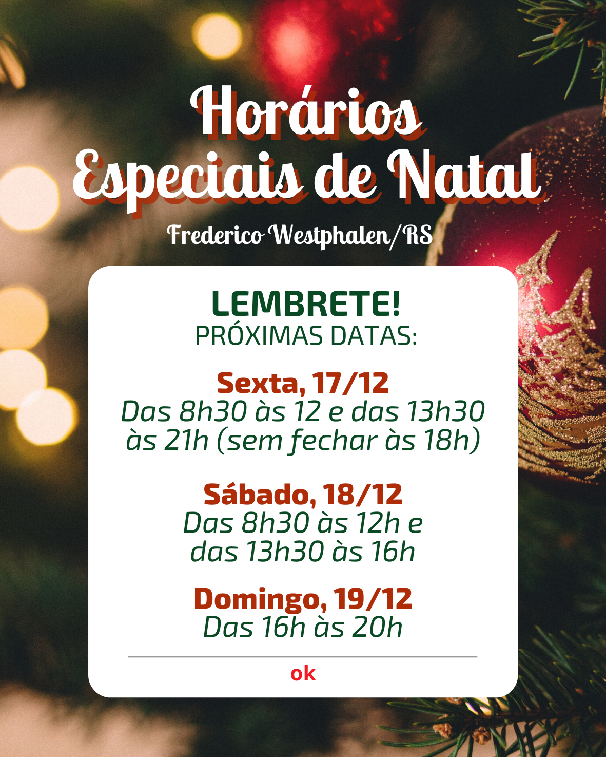 Os consumidores de Frederico Westphalen já estão aproveitando os horários especiais no comércio sábado e domingo e, a partir desta sexta-feira (17), contarão com um horário estendido no turno da noite. As empresas que aderiram à programação especial irão atender em horários diferenciados. Confira a programação das próximas datas especiais: Durante a semana (de