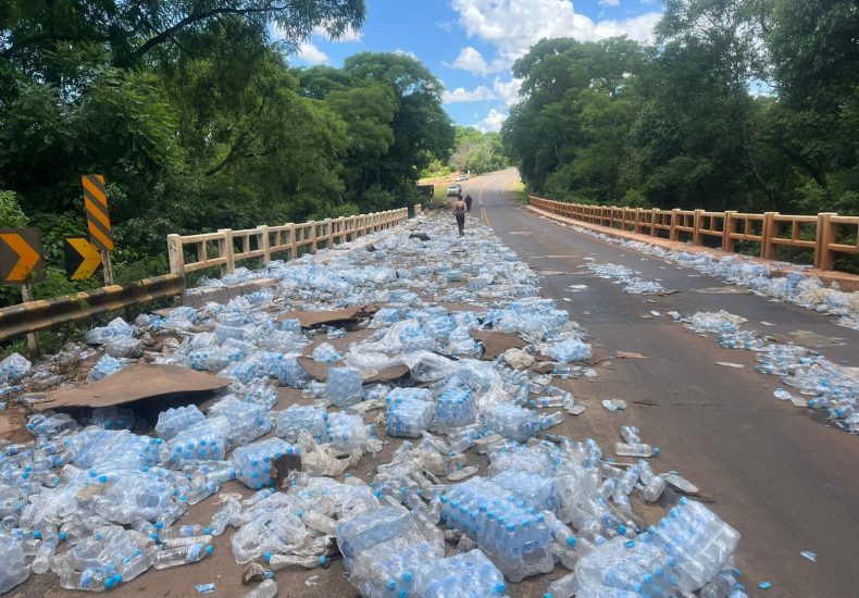 Ocorrência deixou um tripulante levemente ferido e mantém o trânsito em meia pista nesta terça-feira (25) Uma carreta carregada de garrafas d’água tombou no início da tarde desta terça-feira (25) na ERS-569, nas proximidades da ponte do Passo Raso, entre Palmeira das Missões e Novo Barreiro. Segundo informações preliminares, o motorista seguia no sentido Novo