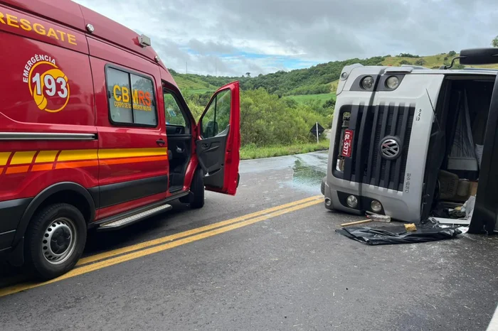 Acidente foi registrado às 7h50min no km 52 da rodovia federal Um homem de 32 anos e uma mulher de 28 ficaram feridos após um caminhão VW com placas de Lages em que estavam sair da pista e tombar na BR-116, em Vacaria.O acidente foi registrado às 7h50min, no km 52 da rodovia federal, logo