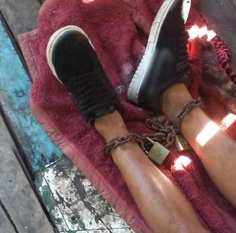 Durante a verificação dentro do local, os policiais encontraram um homem em situação de extrema vulnerabilidade: ele estava com as mãos amarradas e as pernas presas por uma corrente fixada a uma pilastra.