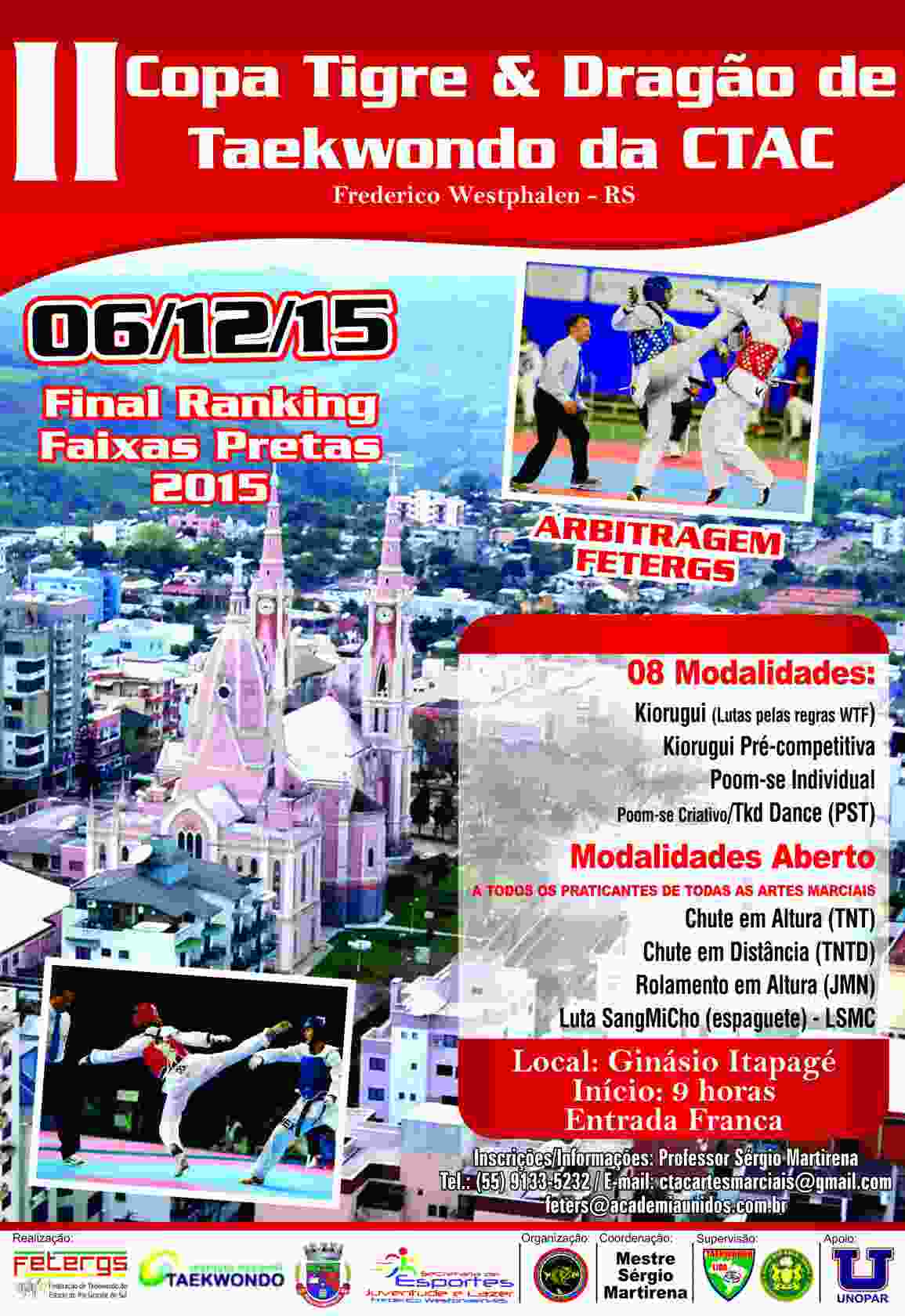 A Competição contará com 9 modalidades, 4 delas só para praticantes do Taekwondo Estilo Olímpico WTF/Kukkwion e 5 delas abertas a todos os estilos de lutas. Interessados devem solicitar inscrição via FETERGS, pelo telefone (54) 3268-5868 ou através do e- mail fetergs@academiaunidos.com.br , até o dia 02 de dezembro.