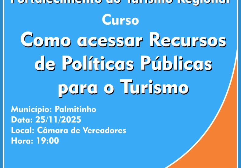 Curso sobre como acessar recursos de políticas públicas do turismo será realizado no dia 25 em Palmitinho