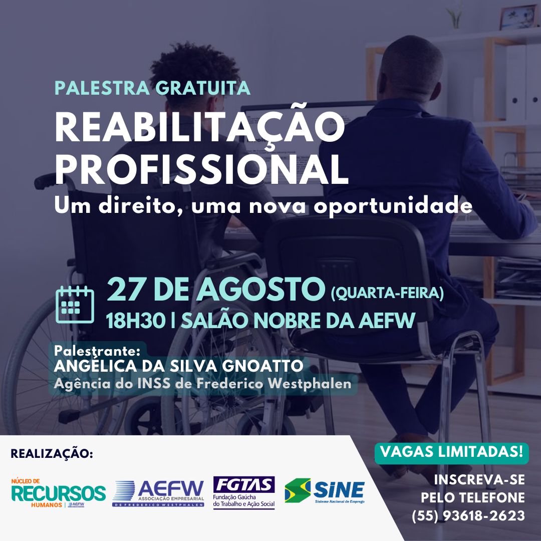 A iniciativa é do Núcleo de Recursos Humanos da AEFW e do FGTAS/SINE/FW e faz parte da 4ª Semana Municipal da Pessoa com Deficiência Intelectual e Múltipla. A palestra será realizada pela Analista do Seguro Social, Angélica da Silva Gnoatto, formada em Serviço Social e referência do Programa de Reabilitação Profissional da Agência do INSS de FW.