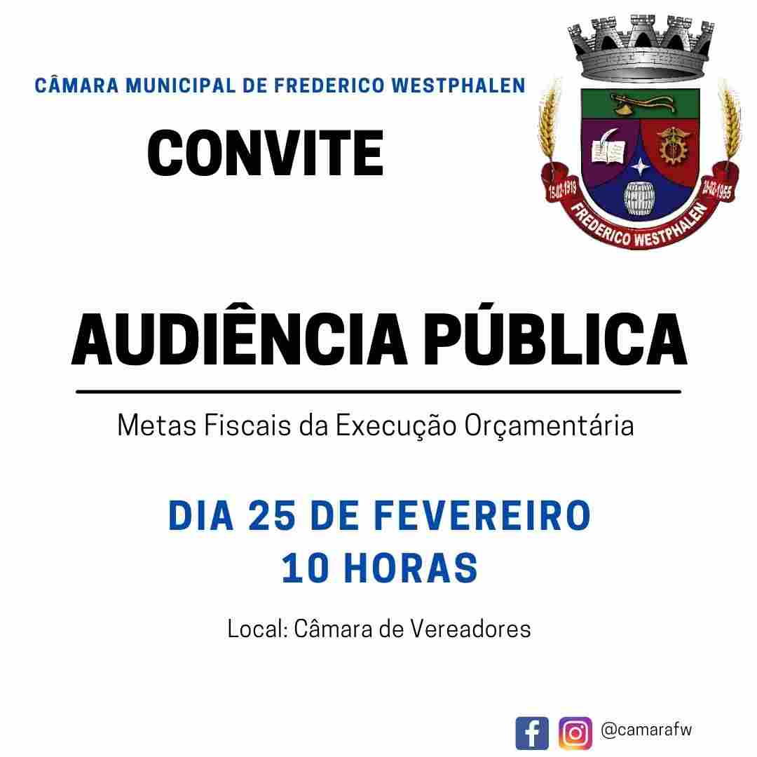 Na próxima quinta-feira, 25, às 10 horas, conforme prevê a Lei de Responsabilidade Fiscal, a Comissão de desenvolvimento Econômico, Fiscalização e Controle Orçamentário da Câmara Municipal de Frederico Westphalen promove a audiência pública para prestação de contas e avaliação das Metas Fiscais da Execução Orçamentária. A audiência acontece na sede da Câmara municipal e é